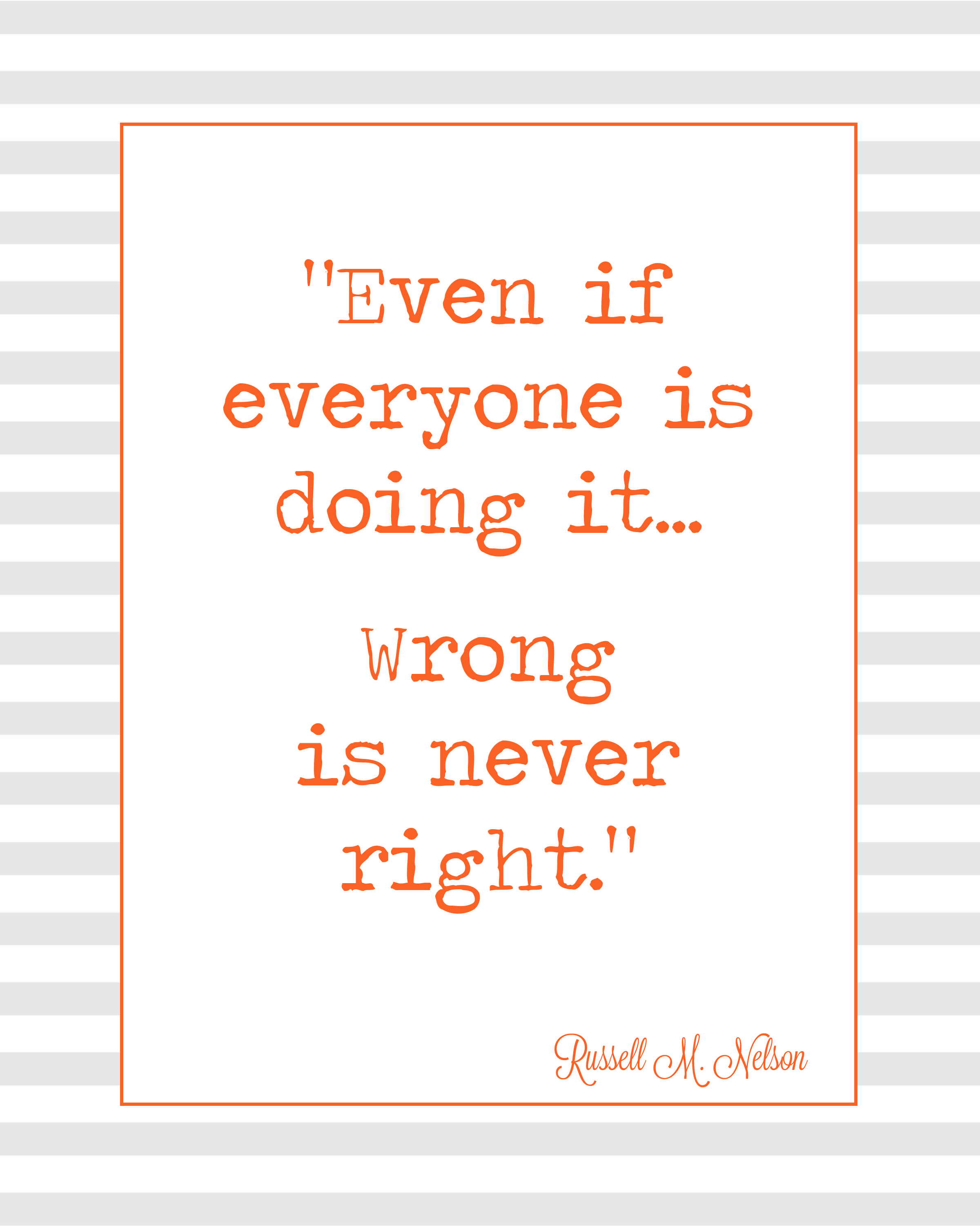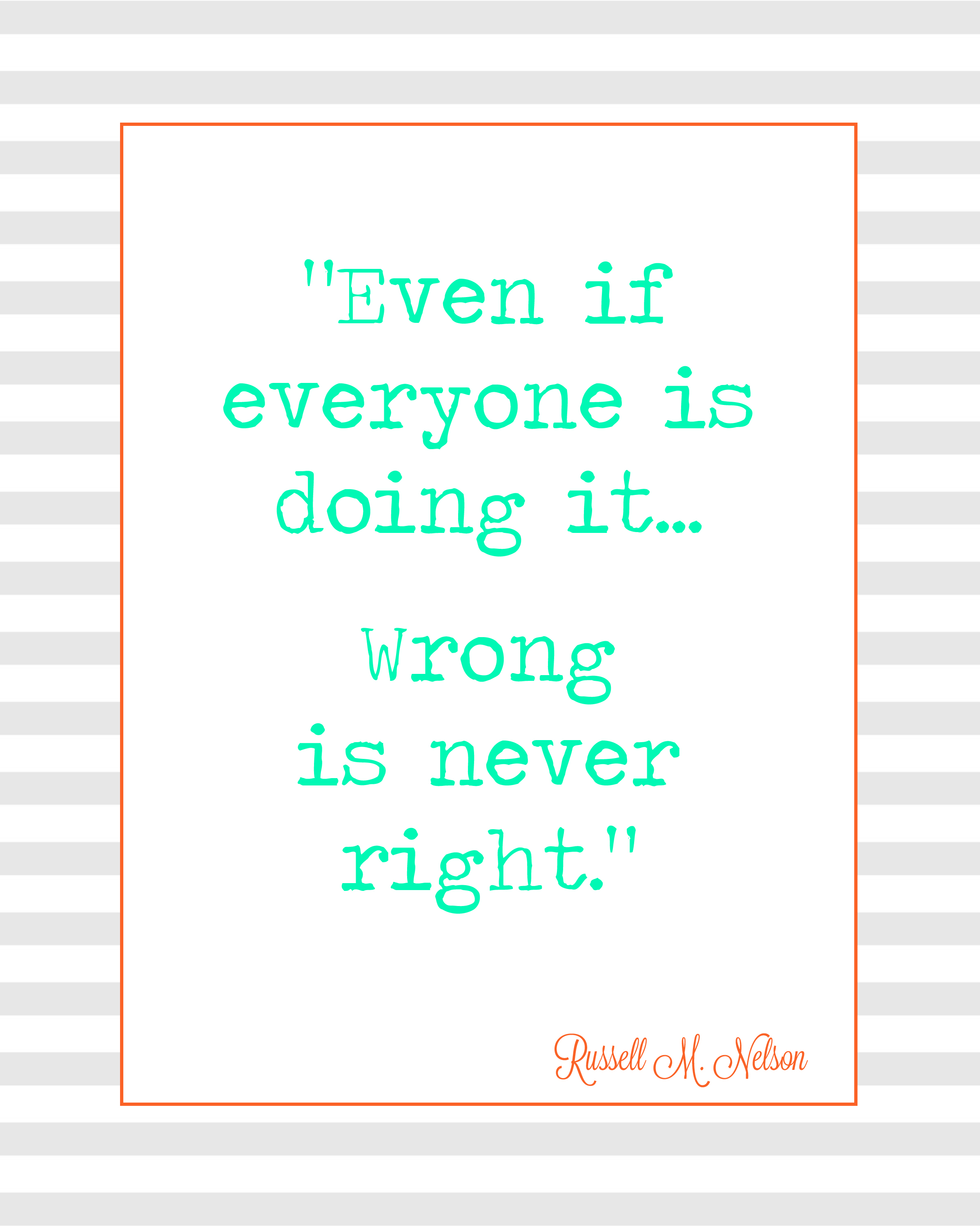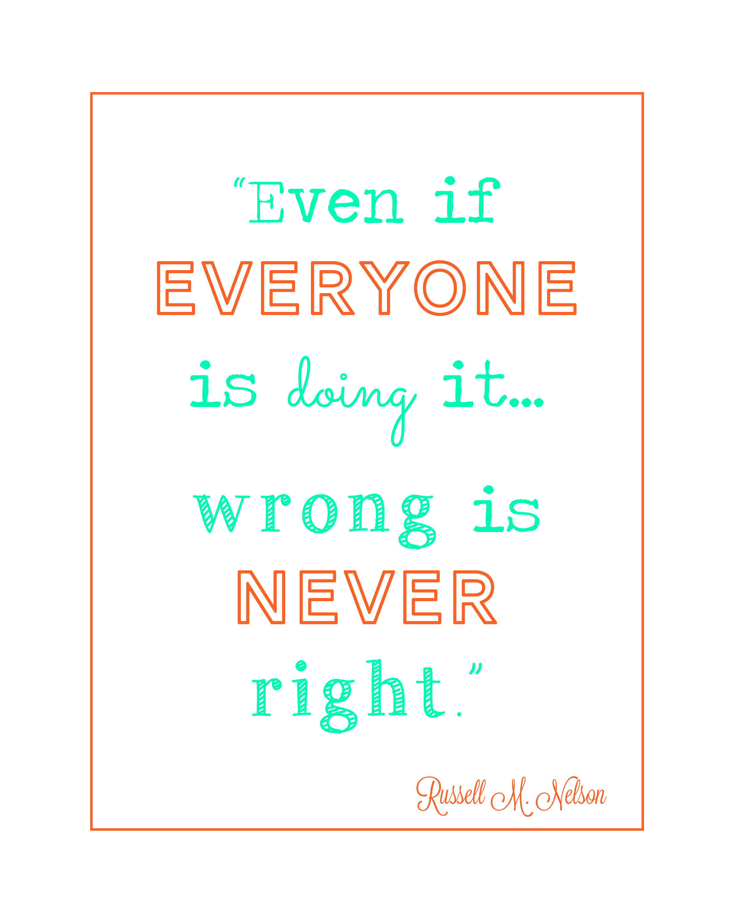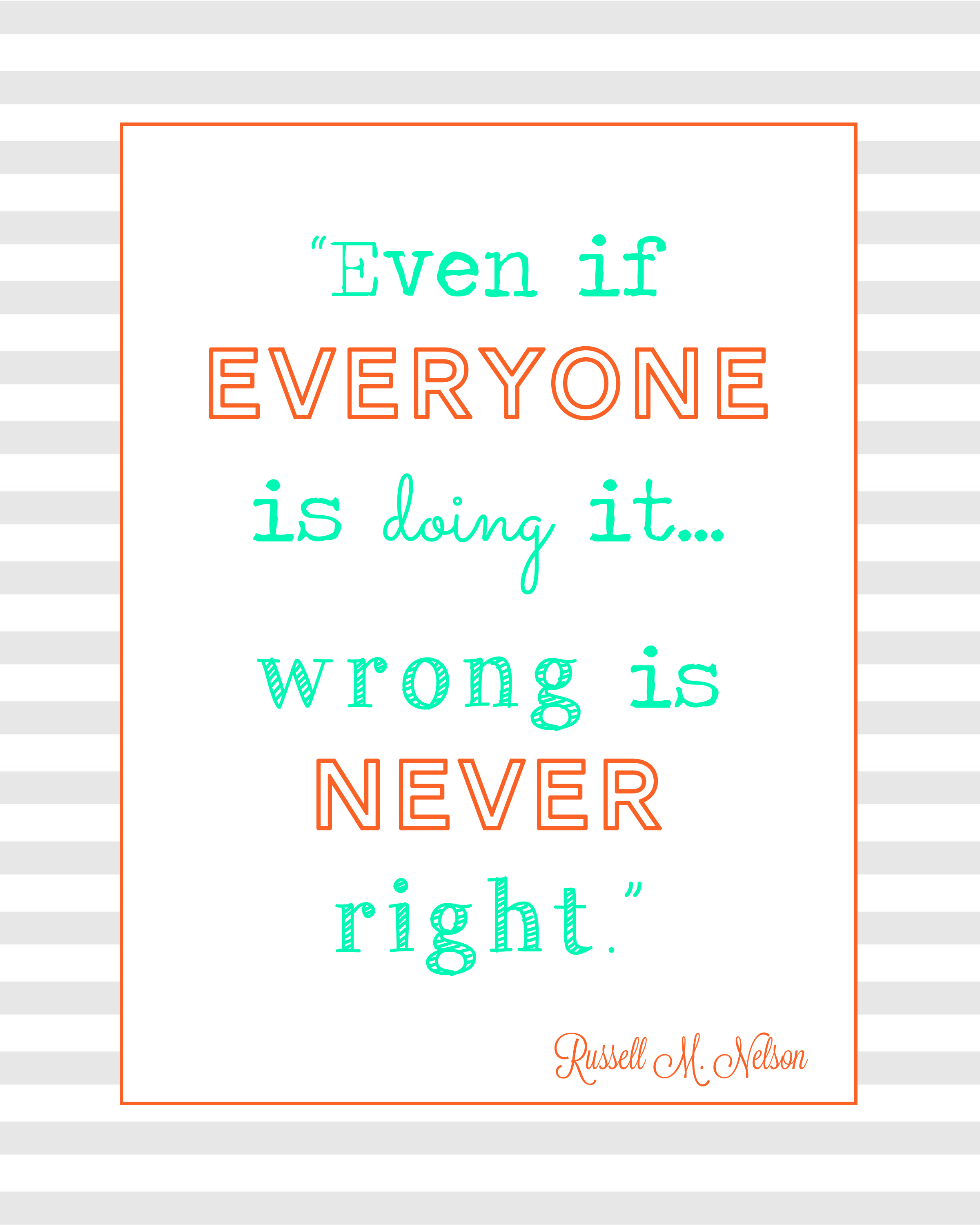 One of my favorite talks given was “Let your Faith Show” by Elder Russel M. Nelson. He talked about living true to our faith, even when others are making choices contrary to our beliefs. I love the simple, but oh-so-powerful way he said, “even if everyone is doing it, wrong is never right.” This quote just really hit home for me, because it’s something we’ve been trying to teach our children to understand. No matter what everyone else is doing, we need to make good choices. I wanted this quote to hang in my home, as a reminder to my children to do the things they know are right. And I want to share this LDS printable with you too {for free, of course!}